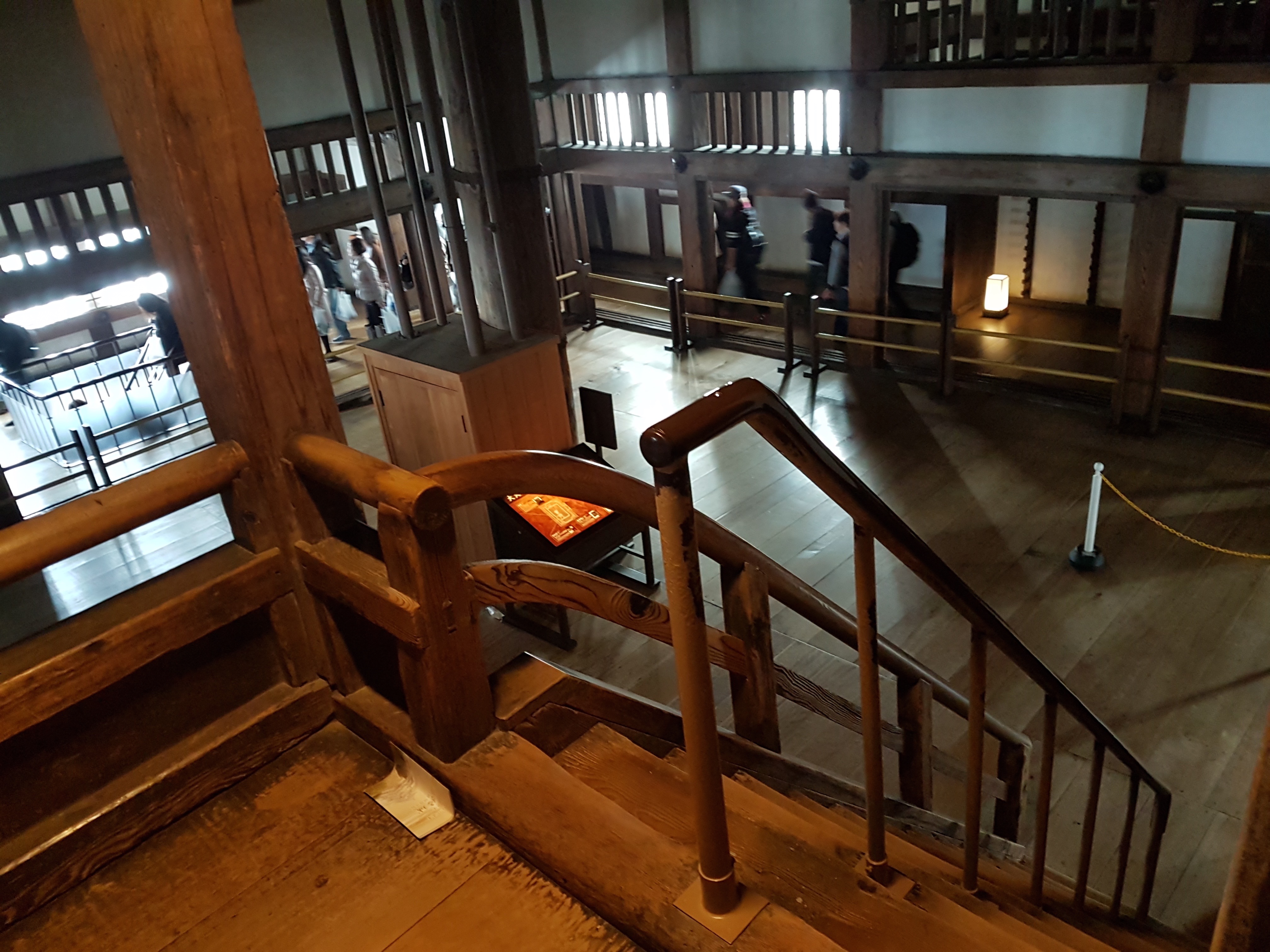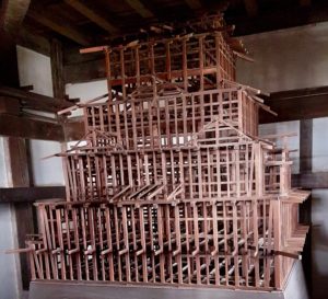Le donjon est une merveille de complexité au niveau de sa structure en bois. Il semble avoir 5 étages de l’extérieur, mais en réalité il y en a un de plus dissimulé, ceci afin de piéger d’éventuels assaillants.
